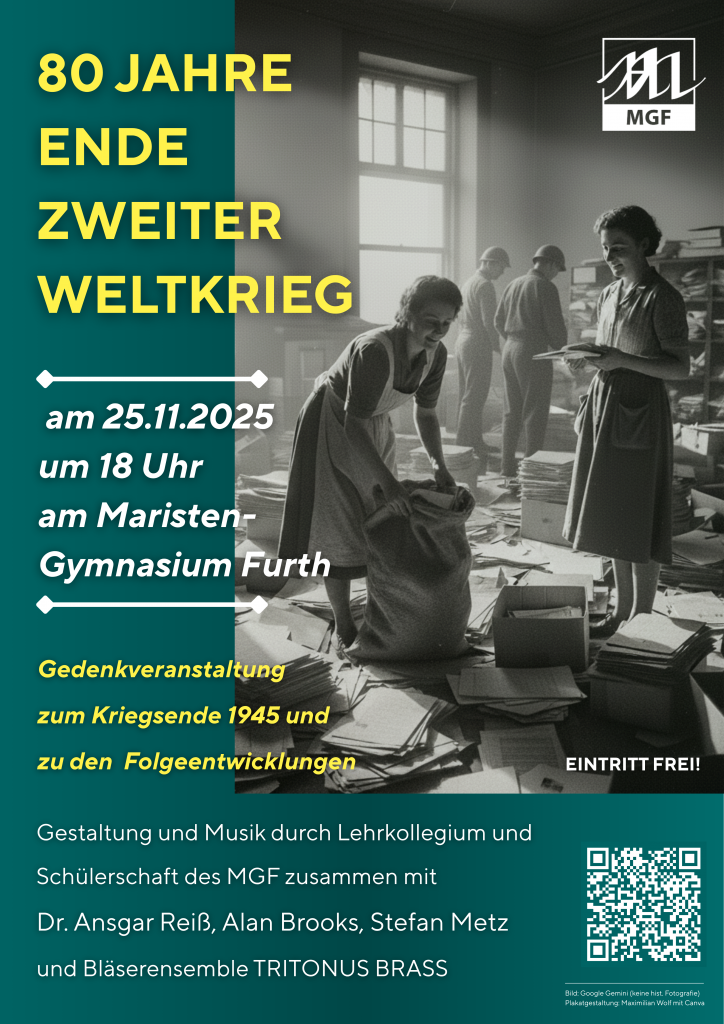 | Dienstag, 25.11.2025, 18:00 Uhr 80 Jahre Ende 2. Weltkrieg Gedenkveranstaltung zum Kriegsende 1945 und zu den Folgeentwicklungen Schulchor Maristengymnasium Stefan Metz, Orgel TRITONUS BRASS Blechbläsersextett musikalische Leitung: Matthias Schäffer Veranstalter: Maristengymnasium geschlossene Schulveranstaltung Maristengymnasium Furth, 84095 Furth, Klosterstraße 6 | ![]() |